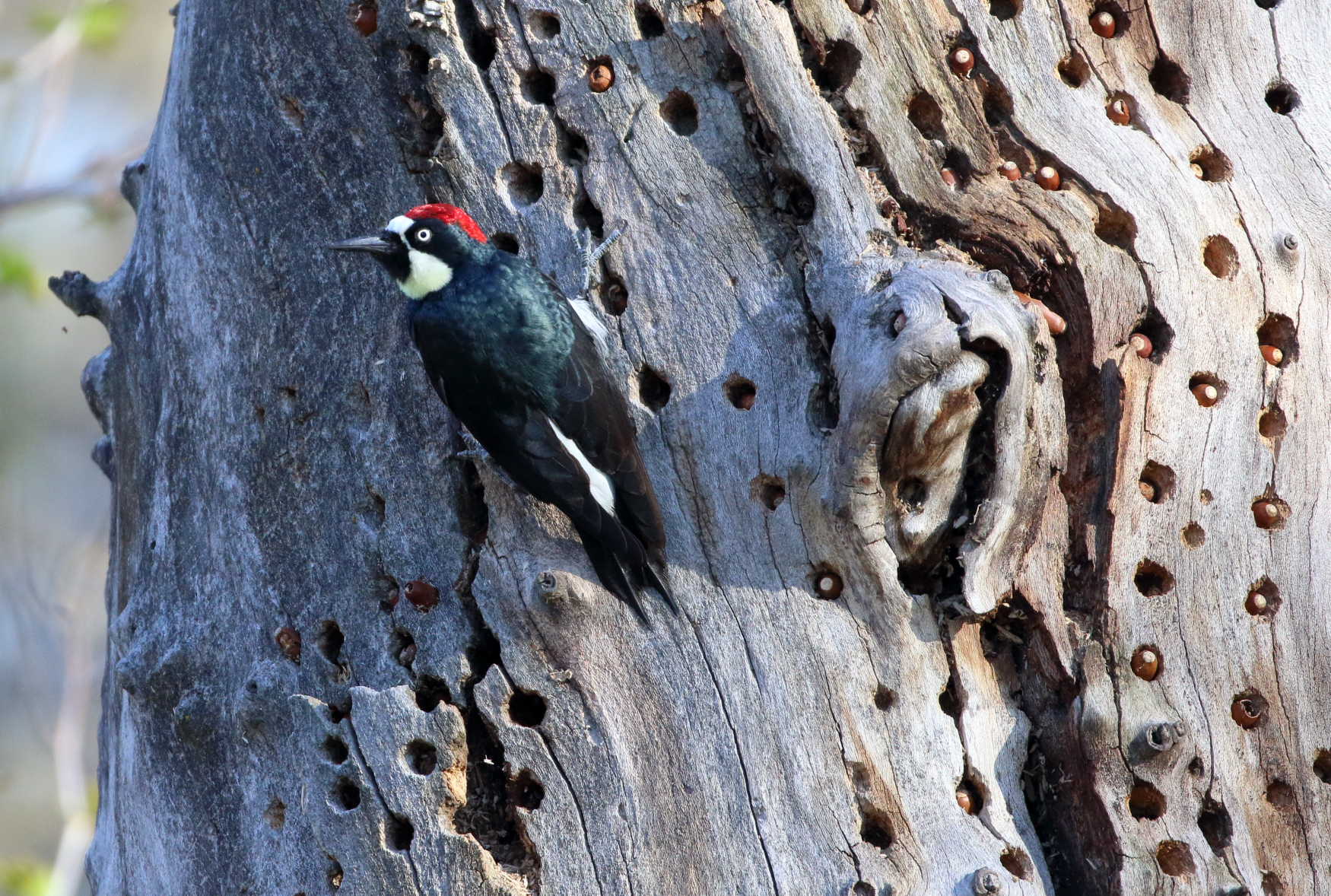 ACWO Chico CA 2024_03_17_9999_41 ← Previous Next → You can’t beat an Acorn Woodpecker on one of its acorn storage trees! With their black masks, these cooperative birds look like banditos, and the way they aggressively mob other species, they apparently can act that way, too.