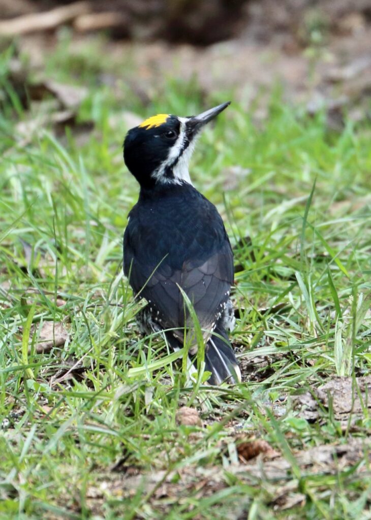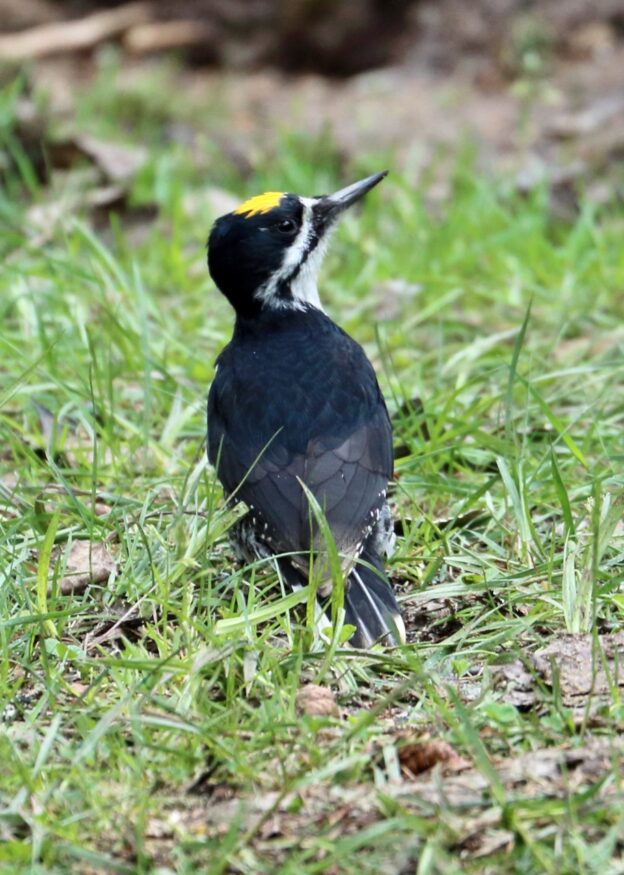 As I slowly stood, taking care not to startle the grouse, I heard strange, frantic calls coming from the woods on the other side of the campsite. I quickly recognized them as calls I’d been listening for all morning, and suddenly, a male Black-backed, decked out in sleek black feathers with a yellow cap, flew into the campsite. It landed on a downed log near me, and proceeded to hop along the ground, getting closer and closer to until it stood only five feet away! It either didn’t notice me or didn’t care, poking for insects in the roots of the nearby spruce trees. After a minute or two, the woodpecker flew away, leaving me debating if I should EVER leave Campsite #512.
