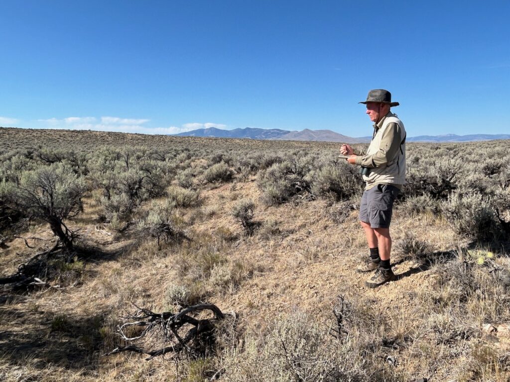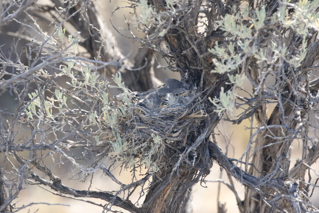 In Beaverhead County, though, not just any sagebrush will do. The birds nest only in taller plants four to eight feet high—plants that can mainly be found growing in the (usually) dry main stream channels of gulches. This year, Jeff and his colleagues located about a dozen nests, one to two hundred meters apart, and as Jeff and I began hiking, it wasn’t long before we spotted an adult bird up ahead. Using GPS coordinates, it took only minutes for Jeff to locate the bird’s nest—a nest with babies!