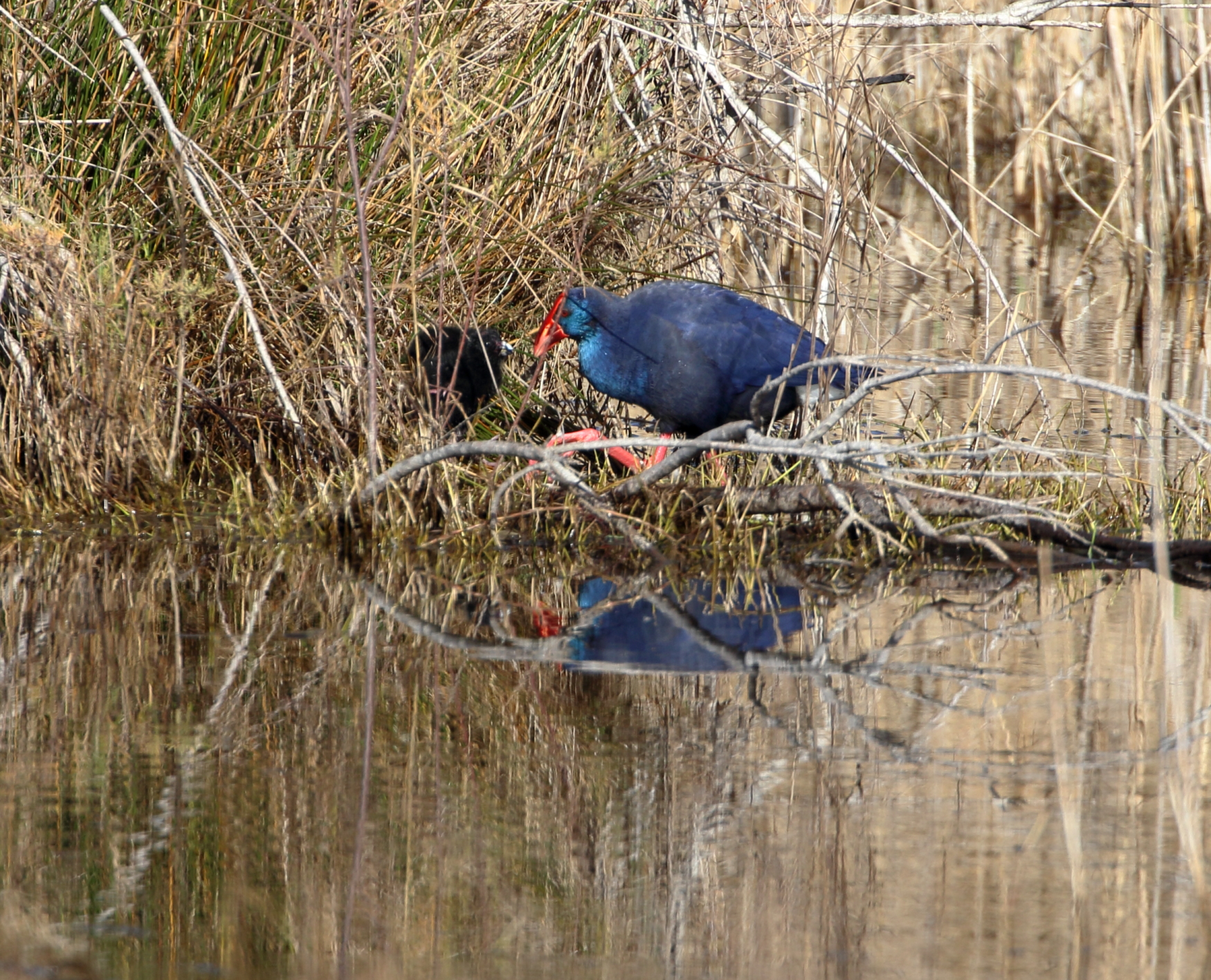 WESH Barcelona Llobregat 2024_02_23_9894 ← Previous Next → Earning Bird of the Trip honors, this rare sighting of a Western Swamphen out at the Llobregat natural area put a lasting grin on my face. That black “shadow” to its left is actually one of two chicks I observed with it.